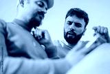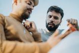 Two men conversing intensely while looking at a smart phone screen in a casual setting. The image captures a moment of interactive communication and technology use outdoors, framed against a clear sky