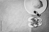 Top view of sandy beach with summer accessories and copy space