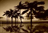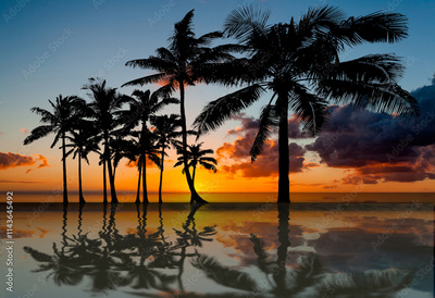 Coucher de soleil avec reflets de cocotiers dans piscine