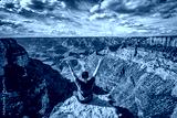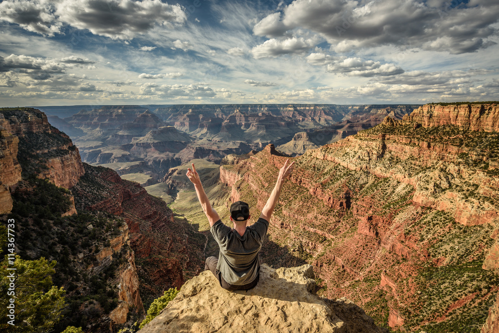 Grand Canyon and a happy hiker on the rim with arms raised up. Winner, success and achievement concept in nature.