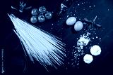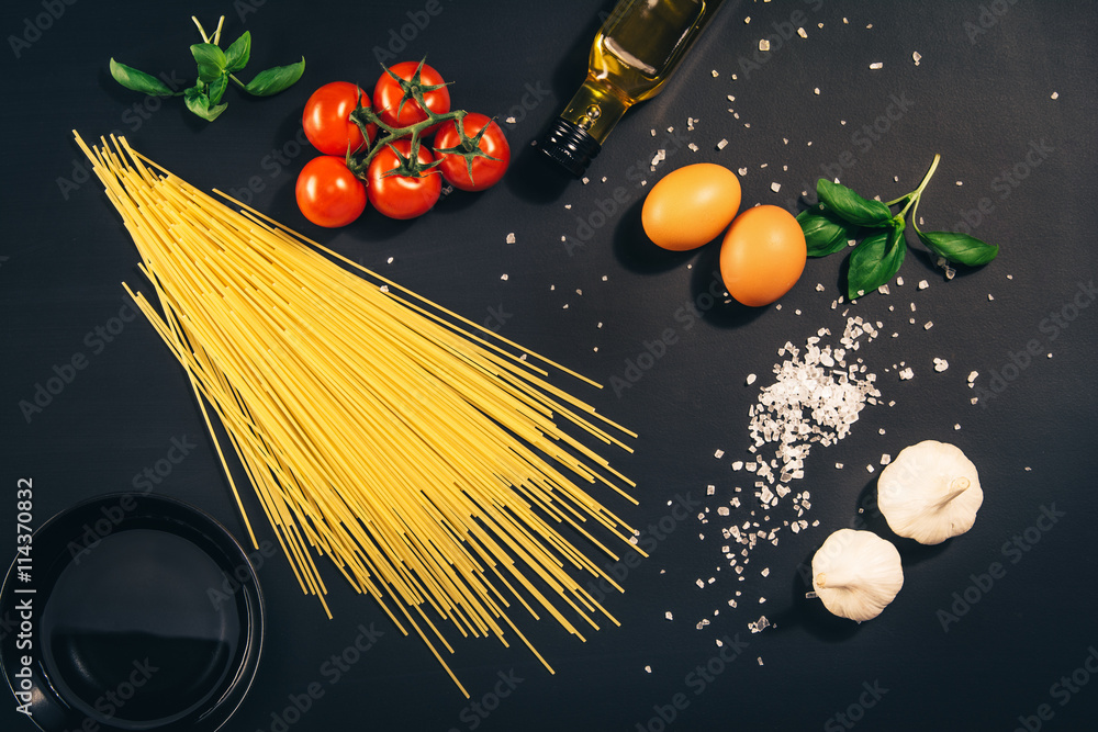 Food ingredients on black, chalkboard table. Photographed from above, top view.