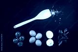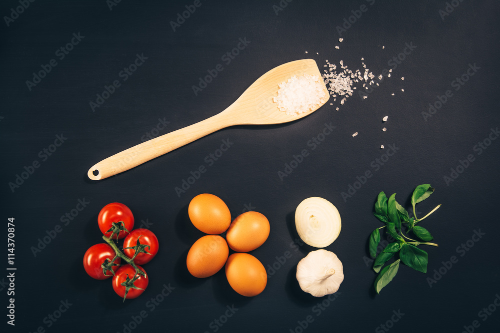 Food ingredients on black, chalkboard table. Photographed from above, top view.
