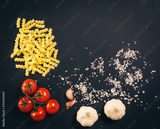 Food ingredients on black, chalkboard table. Photographed from above, top view.