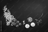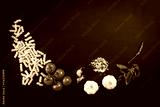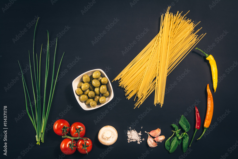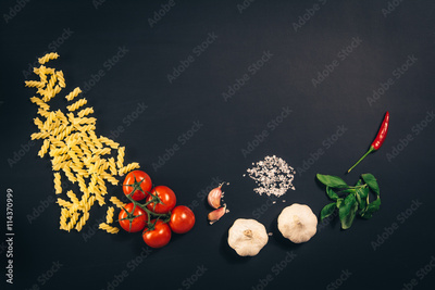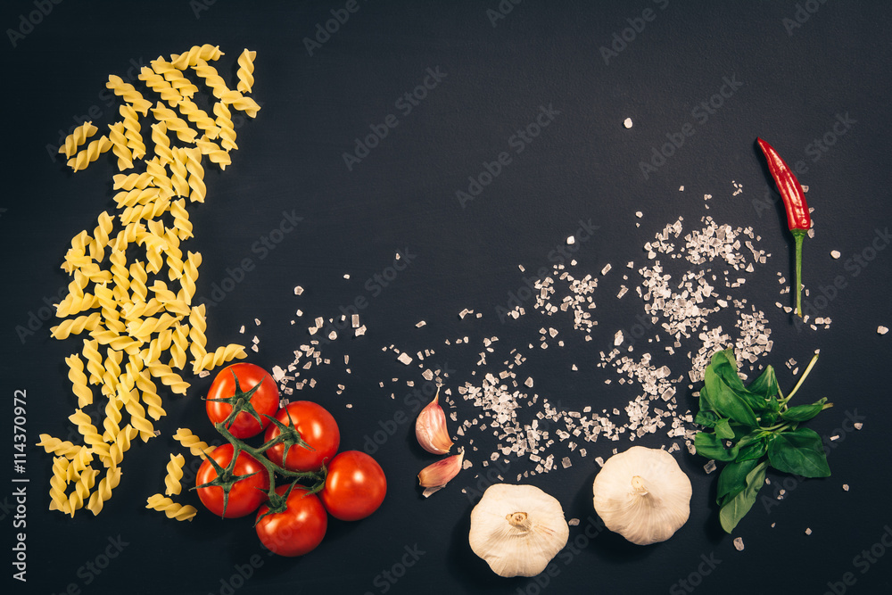 Food ingredients on black, chalkboard table. Photographed from above, top view.