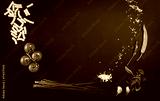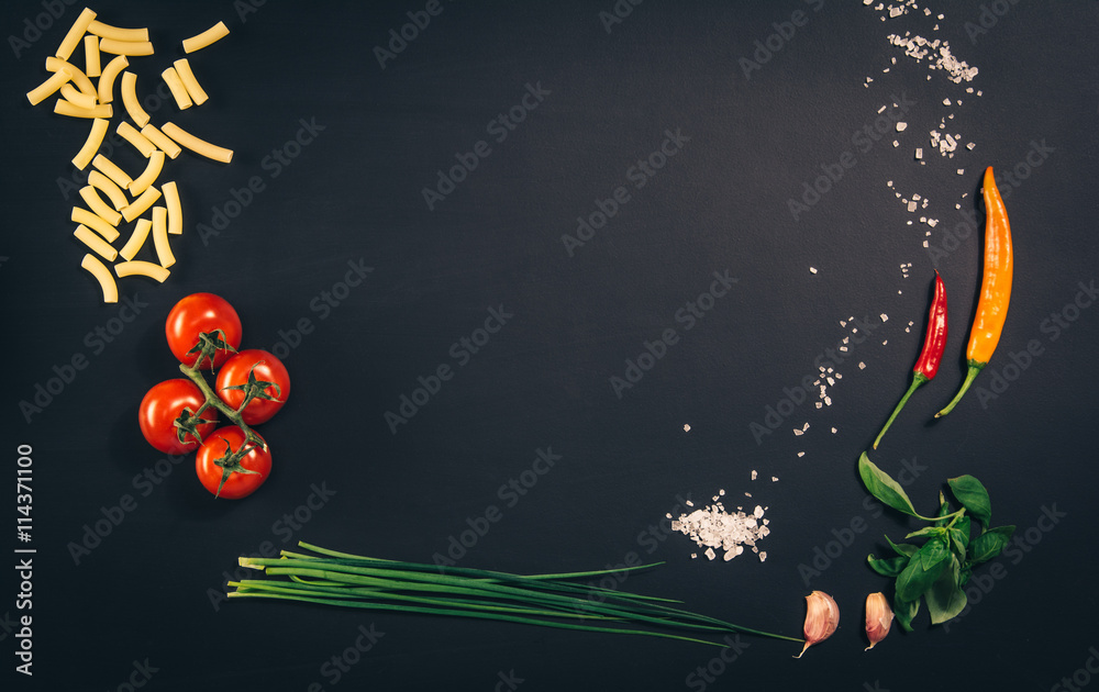 Food ingredients on black, chalkboard table. Photographed from above, top view.