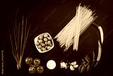 Food ingredients on black, chalkboard table. Photographed from above, top view.