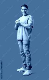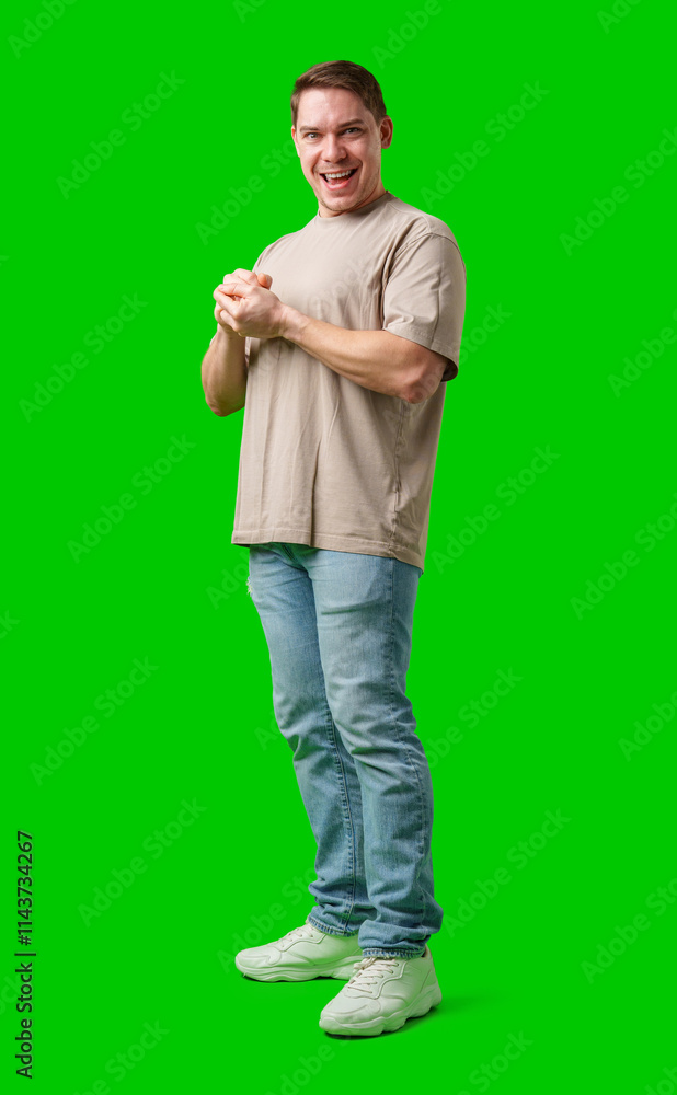 A cheerful man with a friendly smile poses against a bright green background