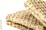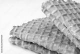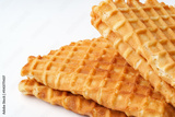 Crispy freshly made waffles stacked on a clean white surface ready to be served with toppings