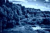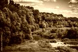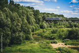 Train coming out of the trees and moving towards bridge on Vistula river in Warsaw, Poland. Photo with light retro filter effect.