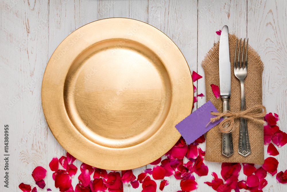 Silverware with an empty tag on a table with an gold plate