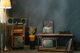 Retro tape recorder and tv standing in the room