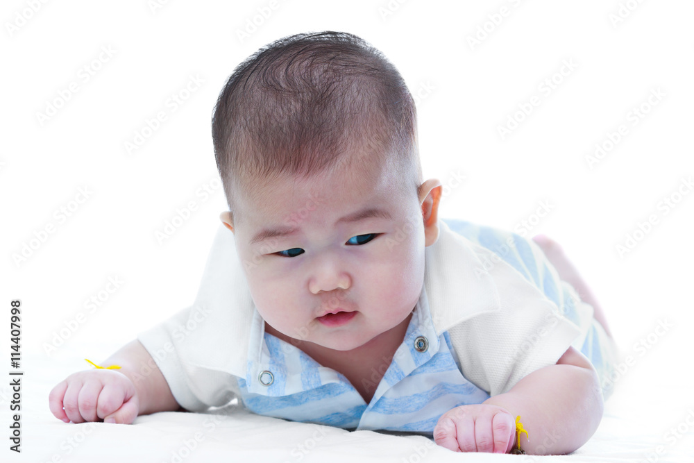 Cute crawling baby. Adorable baby girl, on white background.