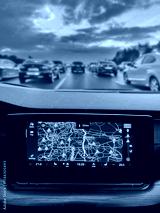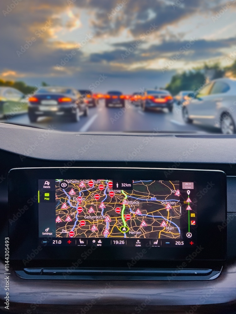 View from inside of a car. Traffic jam on hightway. Most of the roads are closed on navigation map. Social issues and problems.
