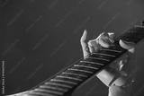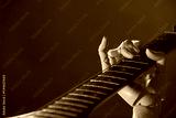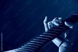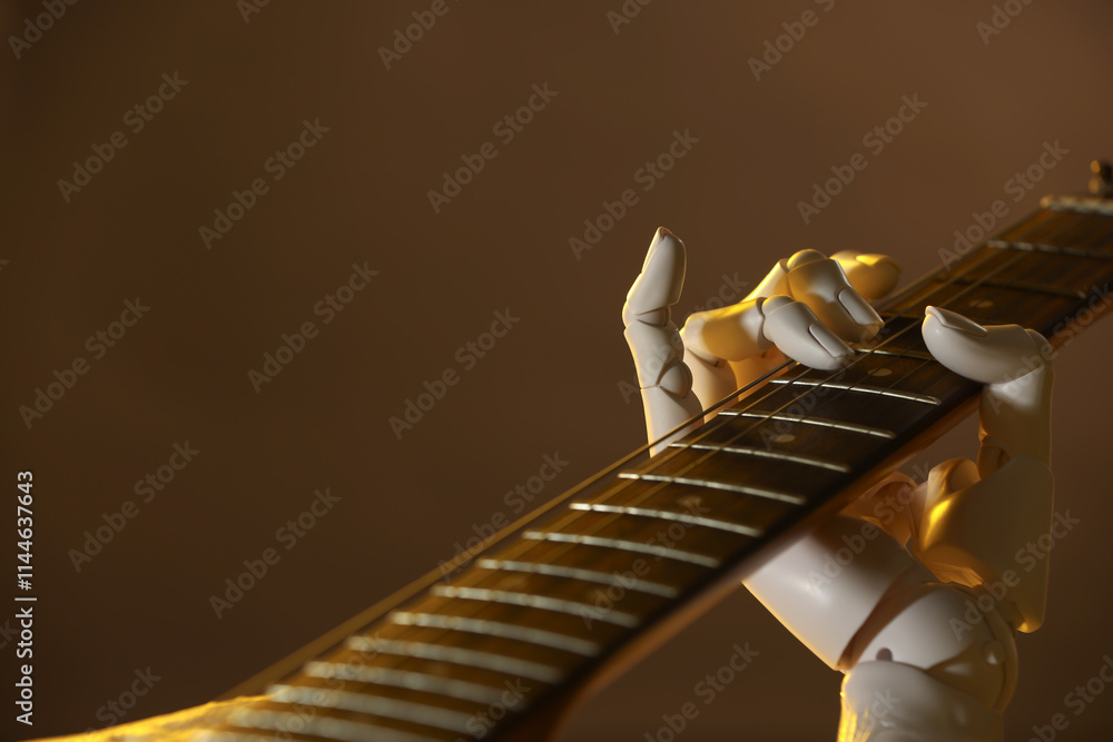 Artificial intelligence. Robot hand playing guitar on brown background, closeup