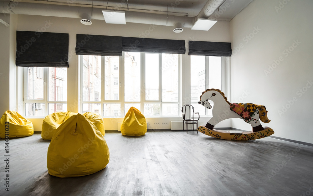 Empty kindergarten room with white walls, big windows, rocking horse and bunch of yellow bean bag chairs.