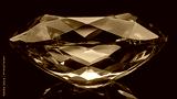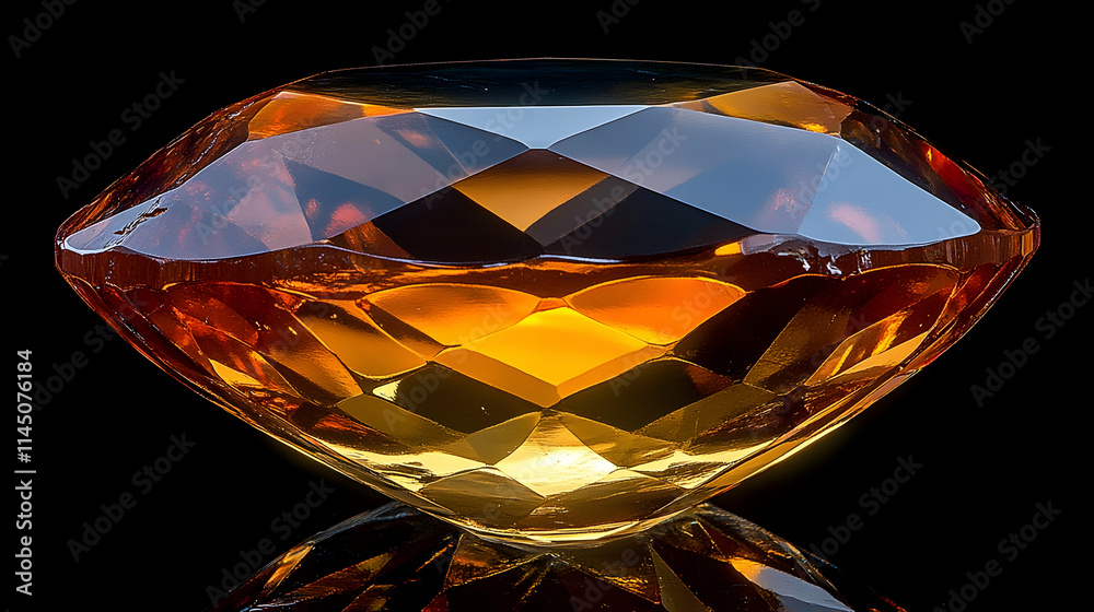 Sparkling amber gemstone with facets and reflections on black background.