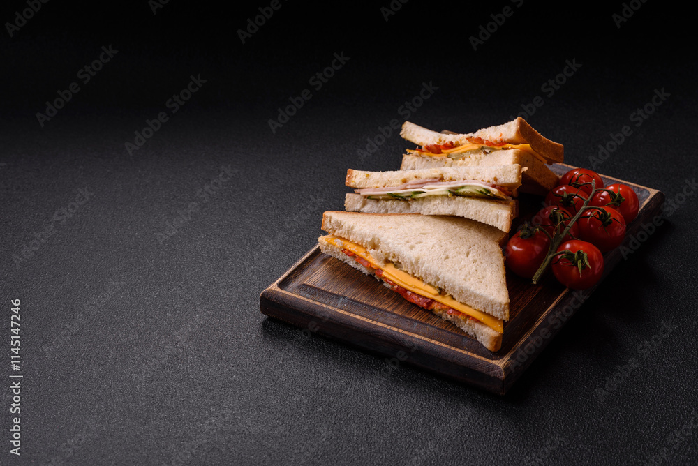 Sandwich with ham, salami, tomatoes, mustard, salt and spices