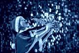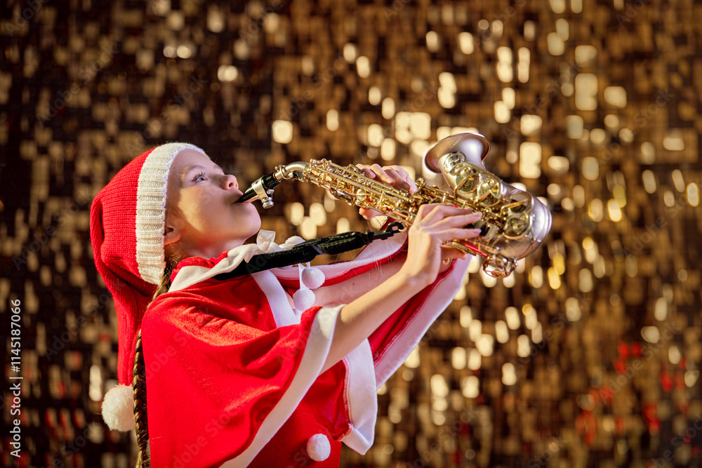 Girl child in red Christmas Santa hat playing saxophone near Christmas tree in decorated hall.