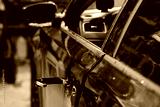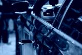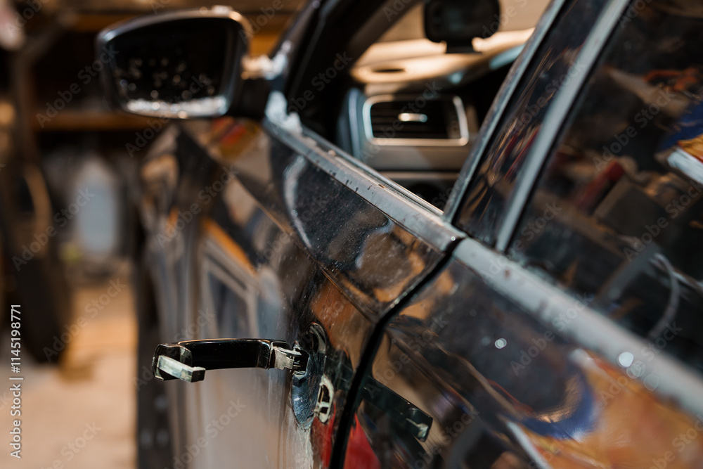 A Close-Up View of a Black Car Door with Water Droplets in a Garage Setting