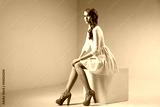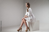 Side view of beautiful girl sitting in white dress