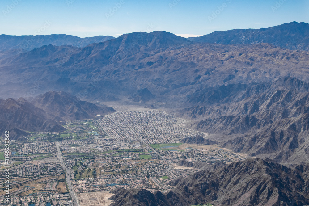 Aerial View of Suburban Neighborhood in Desert Mountain Landscape in Palm Springs Southern California