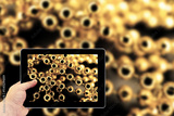 Tablet photography concept. Taking pictures on a tablet. Yellow gold pearl necklace macro abstract background