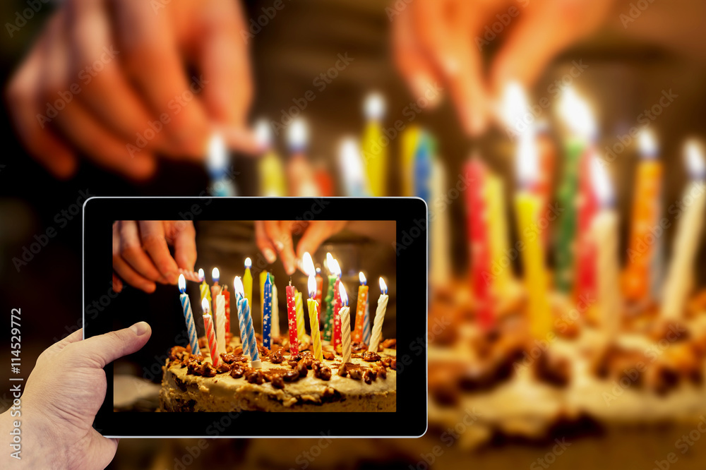 Tablet photography concept. Taking pictures on a tablet. Birthday cake with burning candles in the dark background