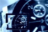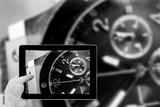 Tablet photography concept. Taking pictures on a tablet. Gold watch macro