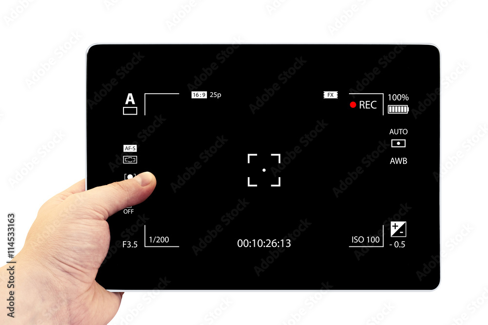 Tablet photography concept. Taking pictures on a tablet. Empty tablet PC in hand isolated on white. Modern digital black camera focusing screen with settings