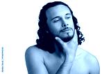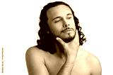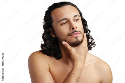 Young man with curly hair thoughtfully posing against a plain background