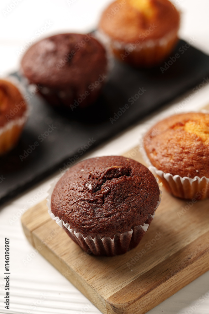 Baked treats on a wooden board with muffins and cakes in soft focus