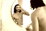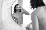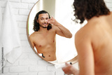 A young man applies skincare cream while looking in a round mirror in a bright bathroom