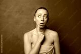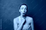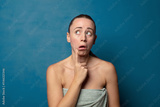 with surprised, nervous, worried or frightened look, looking to the side towards copy space