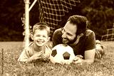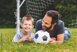 Young father with his little son playing football on football pitch