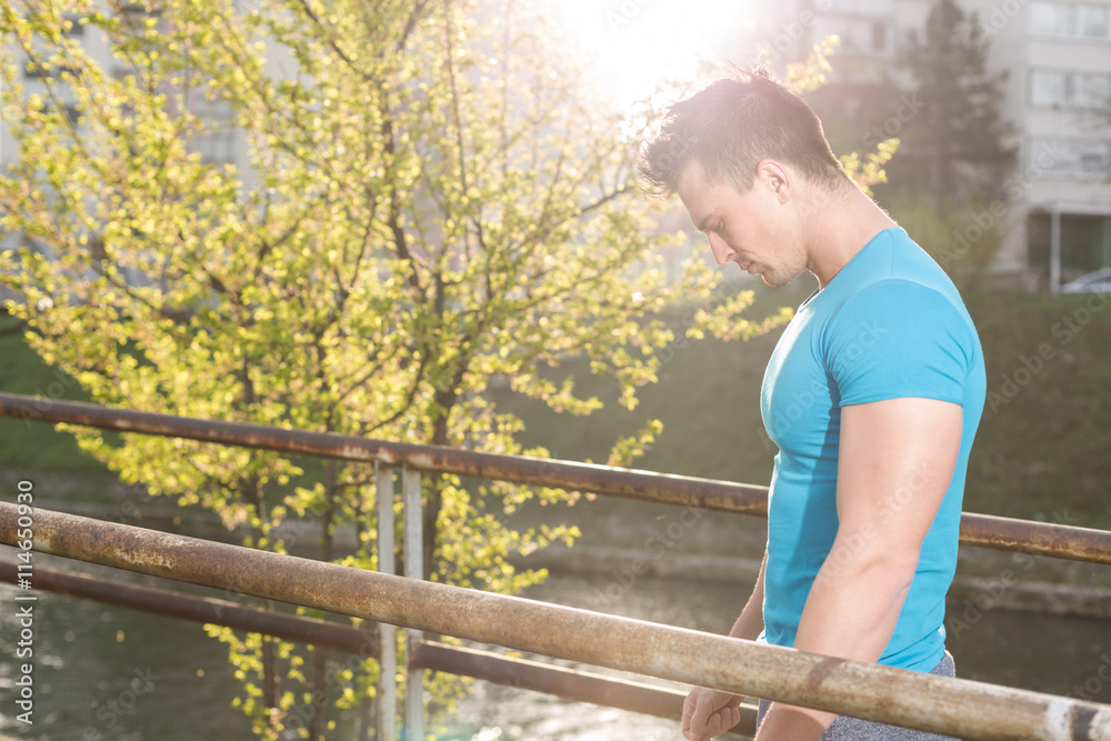 portrait of handsome jogging man while relaxing and take break a