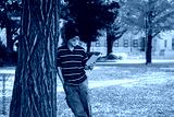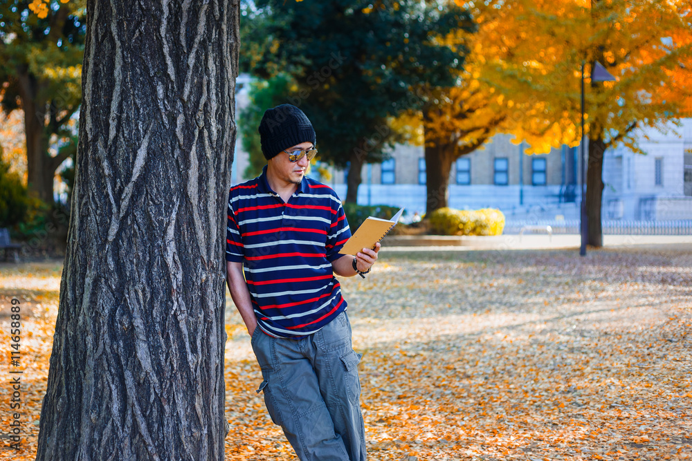 An Asian Man Stands under a Yellow Ginkgo Tree in Autumn