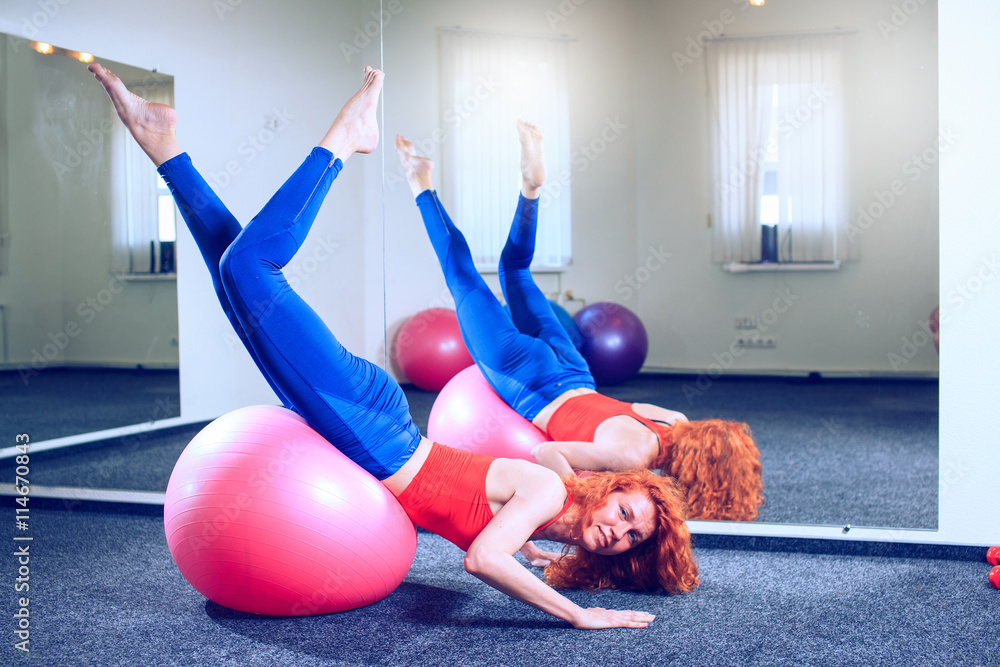 young female instructor doing pilates exercises in sport club