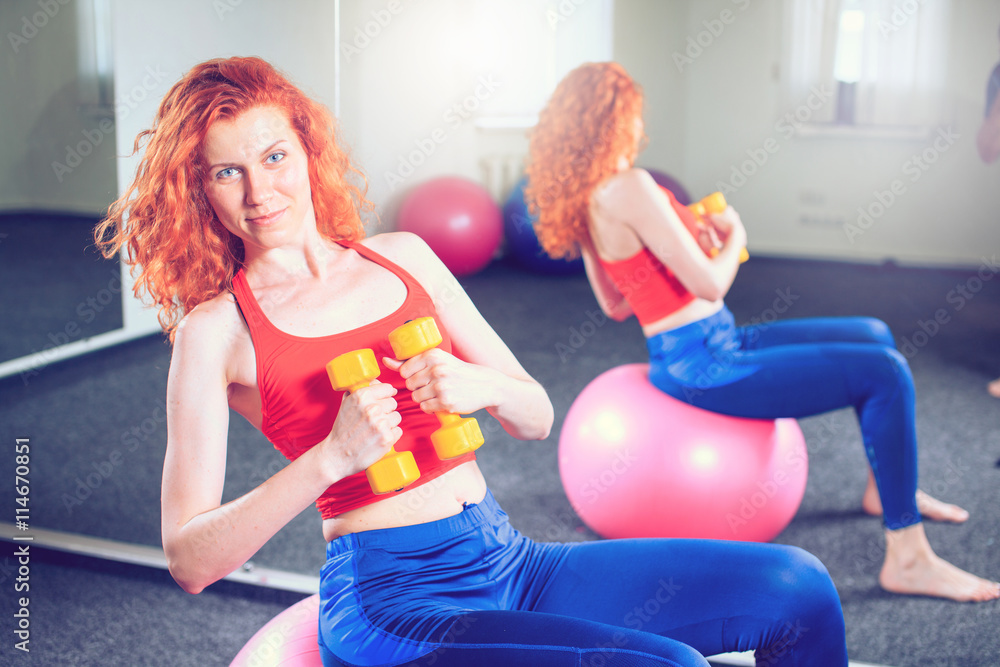 young female instructor doing pilates exercises in sport club