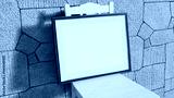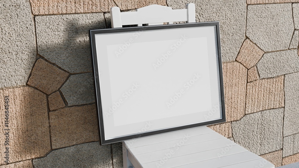Mock up poster dark frame for picture or photography on white wooden chair near textured tiled wall. Template. Modern minimalist interior composition. 3D render, 3D illustration.