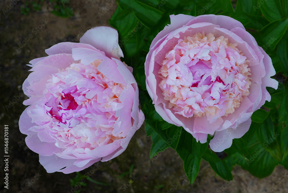 Pink peony flowers growing in the garden in China in the spring
