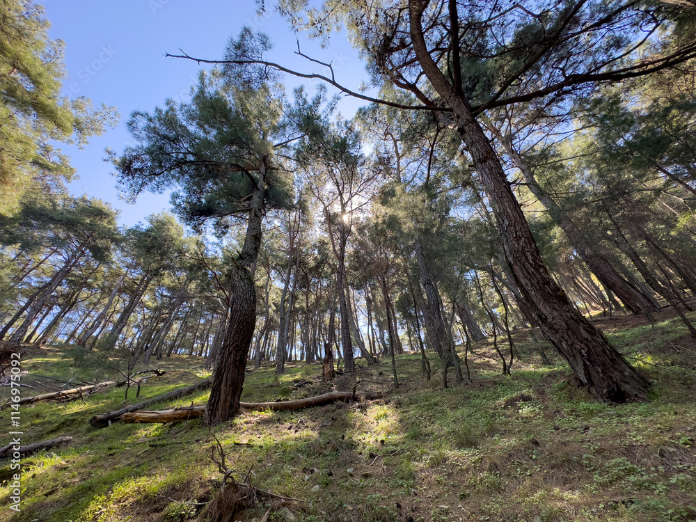 A serene forest with sunlight filtering through the branches, creating a refreshing atmosphere. The vibrant greenery and open sky offer a tranquil environment, perfect for outdoor exploration.