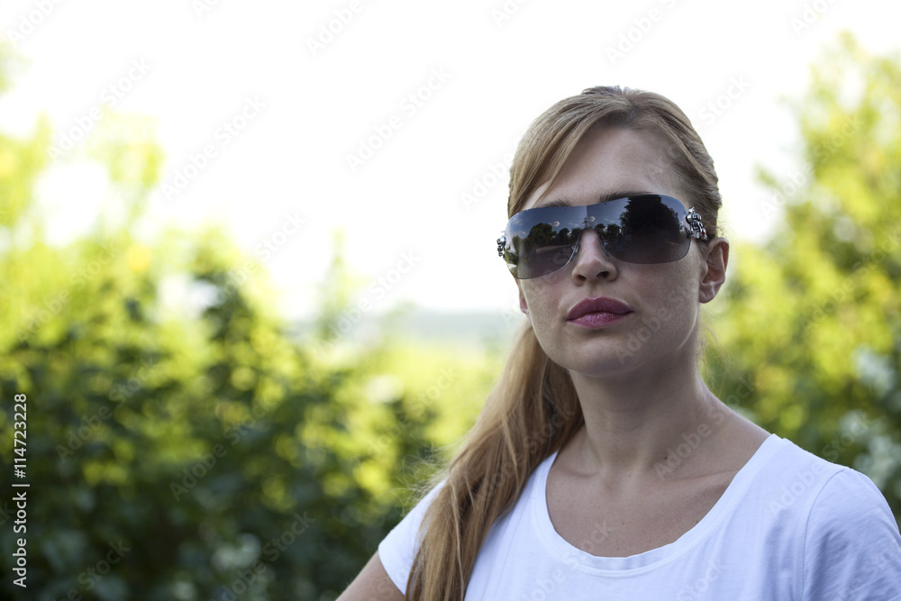 Beautiful blonde woman with sunglasses in Park in summer