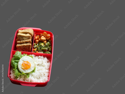 A balanced, healthy meal of rice, egg, stir-fried vegetables, and tofu-tempeh, in a lunchbox, suits busy students and office workers. A free lunch program by Prabowo in Indonesia served in a lunchbox.