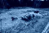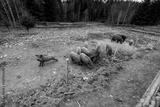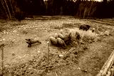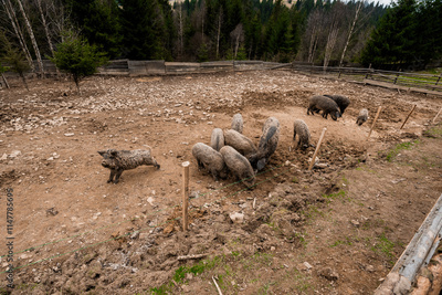 A Scenic View of Pigs foraging on a Rustic Farmstead Amidst Natural Surroundings