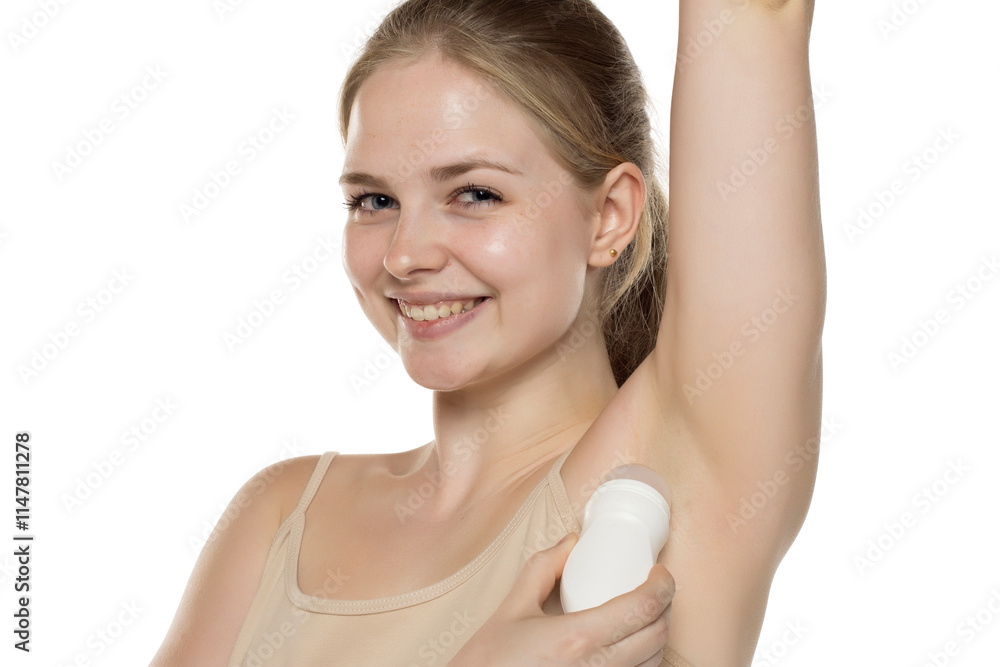Happy blonde woman applying deodorant roller under the arm on a white background.