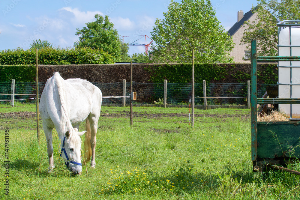 A grazing horse next to a special container with water on a trailer