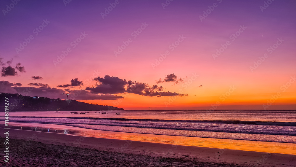 Sunset over the ocean in Jimbaran beach, Bali, Indonesia