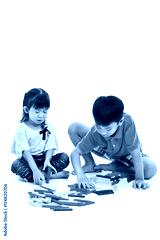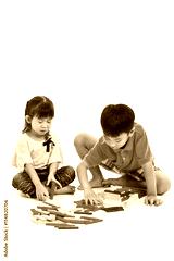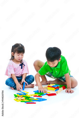 Asian children playing toy wood blocks, isolated on white background