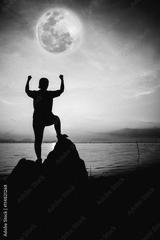 Silhouette of successful woman relax and showing arm up gesture.
