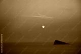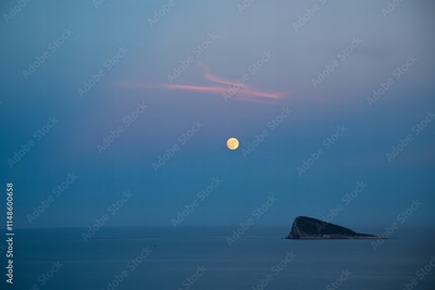 Serene full moon over calm ocean at dusk with small island in Benidorm, Spain.